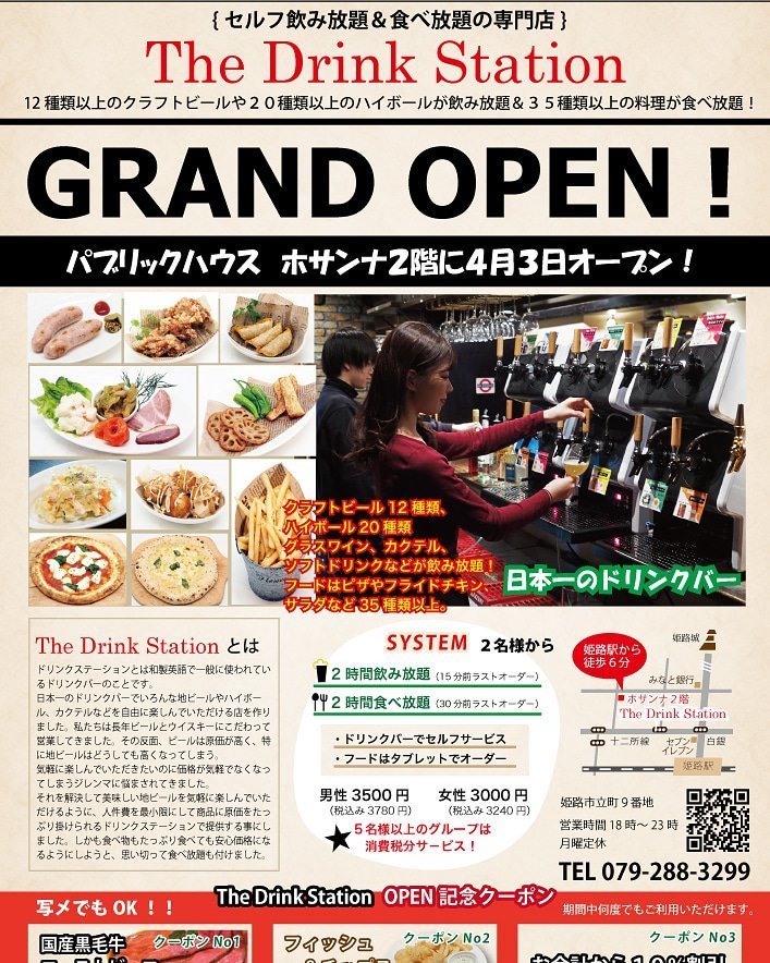 2階が飲み食べ放題専門店の【The Drink Station】に生まれ変わります!クラフトビールを多数揃えたセルフ飲み放題&ビールによく合うフードも食べ放題♪ぜひホサンナついでに、姫路城の夜桜を楽しんでください(笑)写真を見せてくれると、2階でクーポンのサービス!