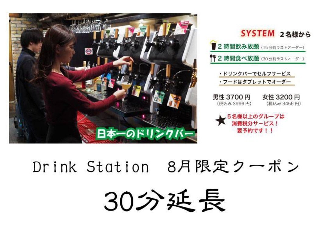 久しぶりに集まった友達や家族とホサンナ2階のDrink Stationはどうですか?この画面を見せていただくと通常2時間利用のところ、30分無料で延長させていただきます!